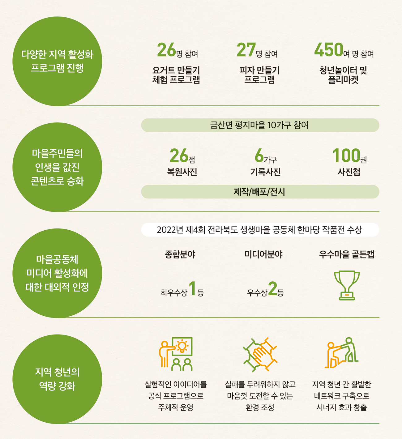 청년들의 도전은 성공적이었다. 청년들이 주도하는 프로그램이라 서툴고 어색했지만 마을 주민들은 적극적인 청년들의 모습에 격려와 칭찬을 아끼지 않았고 프로젝트가 매개가 되어 웃음꽃이 폈다. 작은 것 하나에도 관심을 가지고 적극적으로 참여하는 주민들과, 서툴지만 즐겁게 임하는 청년들의 유대는 숫자로 나열할 수 없는 사업의 큰 성과였다. 실제로 2021년 프로젝트 이후 참여한 마을 주민을 대상으로 진행한 만족도 조사 결과 마을 주민 모두가 청년들의 마을 활동에 만족했고, 다시 진행한다면 적극적으로 참여하겠다고 의향을 밝혔다. 청년들 역시 농촌에서 청년들이 할 수 있는 다양한 활동에 대해 긍정적으로 생각했고, 보다 많은 마을 주민이 참여할 수 있는 여건이 만들어지면 좋겠다는 의견을 피력했다. 실제로 ‘프로듀사’팀은 2년 연속으로 리빙랩에 참여해 여러 마을의 기록에 참여하고 있다.