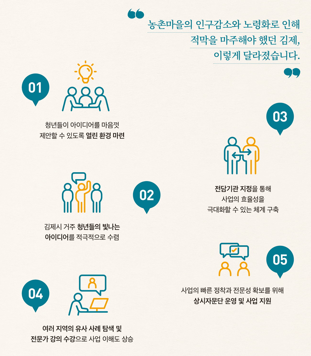 하지만 농촌지역에 산재한 복잡한 문제들을 해결하기 위해 주도적으로 나설 수 있는 연령층의 노령화로 농촌 상황의 개선은 쉽지 않았다. 김제시는 농촌 인구의 감소와 노령화를 극복하는 방법으로 김제 시내에 거주하고 있는 청년들에게 도움을 청했다. 청년의 눈으로 농촌의 오늘을 살피고 그들의 방식으로 해결책을 찾아보기로 한 것이다. 청년들과 함께 고민하고 함께 나은 내일을 만들어 보기 위한 시도였다. 이를 위해 김제시는 먼저 청년들이 지역의 문제를 적극적으로 들여다보고 이를 해결하기 위한 다양한 실험을 해 보는 ‘리빙랩’의 개념을 도입해 청년들이 적극적으로 아이디어를 내고 도전할 수 있는 환경을 마련했다. 기획감사실과 농촌활력과에서 사업의 기본계획을 마련하고 농어촌종합지원센터를 농촌협약지원센터·역량강화 전담 기관으로 지정해 사업이 효율적으로 진행될 수 있도록 체계를 마련했다.