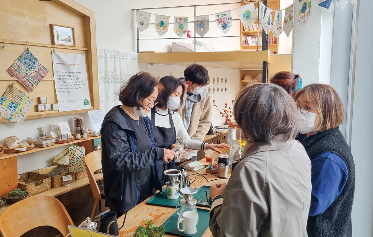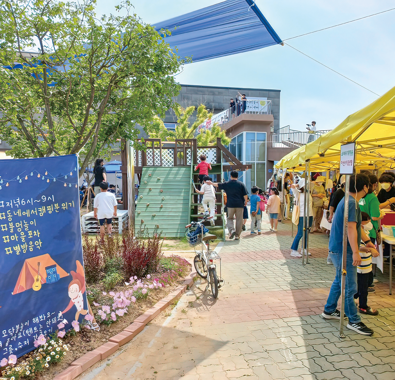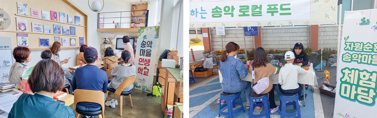 지역경제 활성화는 ‘송악마을사람들’이 운영하는 ‘마을공간 해유’를 중심으로 이루어졌다. 지역 내의 생산-소비로 이어지는 순환경제 모델을 창출하면서 마을 일자리 창출까지 뒤따른 것이다. ‘해유’는 마을 경제 회생의 동력이 됐다. 로컬장터 송악놀장과 송악마을장, 송악마을예술제 등의 운영으로 송악면 소재지 주민과 만나고, 정보 교류 및 소통의 장(場)을 활성화하여 경제적 영향력을 인근 마을까지 확장하기에 이르렀다. ‘송악마을 함께돌봄 사업’도 각광 받는 타이틀이다. 이는 마을에 사는 어르신들을 주민 스스로 돌본다는 의미다. 마을은 이를 위해 인적 네트워크를 구성하는 등 체계적인 틀을 잡아나갔다. 사회적기업과 협업하고 고용노동부 신중년 일자리 사업과 연계한 코디네이터들이 마을 어르신들을 직접 찾아가 심리상담, 미술 치유, 건강 먹거리 나눔, 치유 원예 등 다양한 심리·정서 프로그램을 실천하는 것이다. 이렇게 진행한 반찬 나눔과 송남중학교 학생 및 학부모 80여 명이 참여하는 ‘마을살이 봉사활동 동네 손주 왔어유!’는 이 사업의 백미였다. 가족과 이웃 간의 세대 소통은 물론 이웃 어른을 만나고 그들의 이야기를 듣는 특별한 활동이었다.