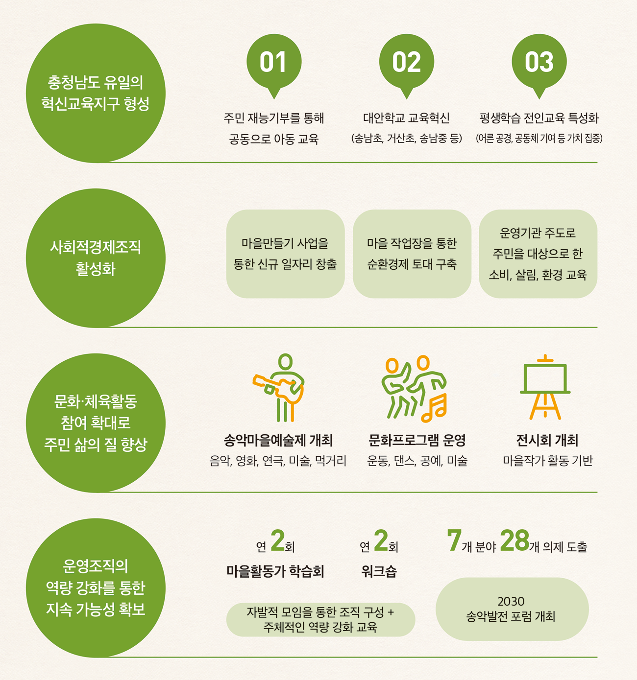 송악은 대부분의 농산어촌이 겪고 있는 공통적인 문제점을 안고 있었다. 인구소멸, 고령화, 지역소멸 등이 그것이다. 이러한 문제점을 파악하고 하나씩 구체화하며 그 해결점을 찾는 것부터 시작했다. 각각의 공동체를 구축하면서 이를 실현해 나간 것이다. 인구소멸은 마을교육공동체를 통한 마을교육네트워크로, 고령화는 마을돌봄공동체에서 ‘돌봄코디네이터’를 추진하는 것으로 대응했다. 또 지역소멸에 맞서 마을협동경제공동체를 통한 마을공유경제를 확보했다. 3개의 큰 축으로 구성된 마을공동체는 ‘마을공간 해유’를 통해 인구 유입 요인을 발굴, 특화를 통해 마을 발전의 근본적이면서 궁극적인 목적을 달성했다. 민·관·학의 거버넌스 구조에서 진행된 사업이었으나, 관의 주도가 아닌 주민들의 소통을 기반으로 한 운영과 결속으로 진행된 결과였다. 2021년 송악면은 지역발전과 주민 삶의 질 개선 등 농촌 공동체 활성화를 도모하며 마을만들기에서 우수 사례로 선정되었고, 행복농촌만들기 콘테스트에서 농림축산식품부 장관상을 수상하기도 했다.