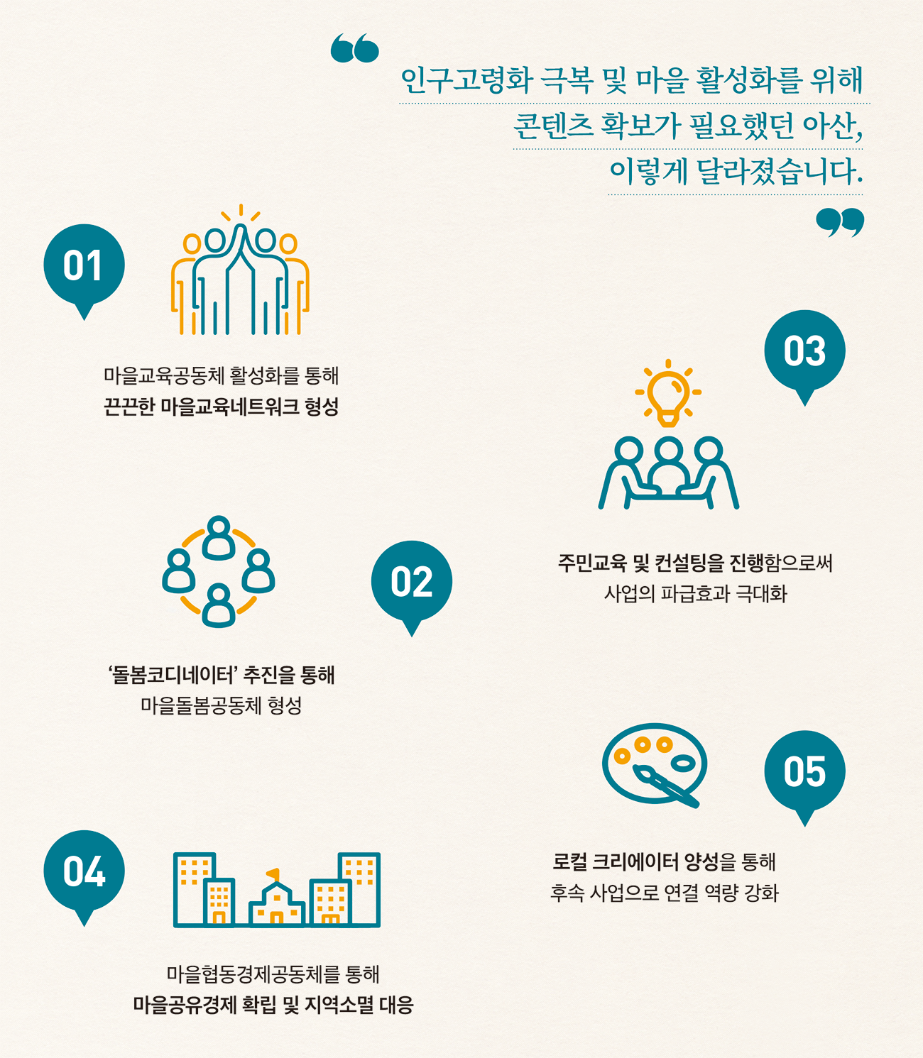 아산시는 2010년부터 국가 균형발전을 통한 지방소멸에 대응하여 일반농산어촌개발사업 38개 지구 87,039백만원을 투자하여 농촌 주민의 삶의 질과 농촌의 정주여건을 개선해왔습니다.