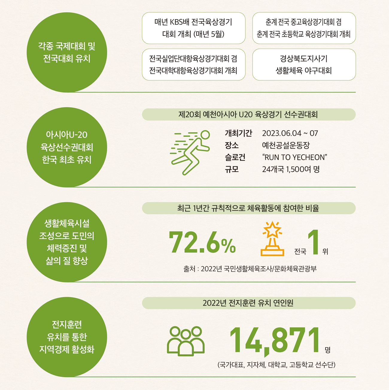 예천은 이미 각종 국내외 대회를 개최하고 선수훈련 기반을 조성함으로써 우수한 체육인재 육성뿐 아니라 국민적 체육활동의 활성화에 기여해 오고 있다. KBS배 전국육상경기대회를 매년 개최하고 있을 뿐 아니라 초·중·고 및 실업 육상경기대회를 꾸준히 개최하여 우리나라 육상 발전의 견인차 역할을 톡톡히 하고 있다. 예천스타디움 또한 매우 다양하게 활용하고 있다. 지역축제와 연계한 스포츠이벤트는 물론, 전문 선수들 외에 일반인도 함께하는 다양한 행사를 개최함으로써 체육, 특히 육상 인구의 저변 확대에도 적극적으로 노력하고 있다.