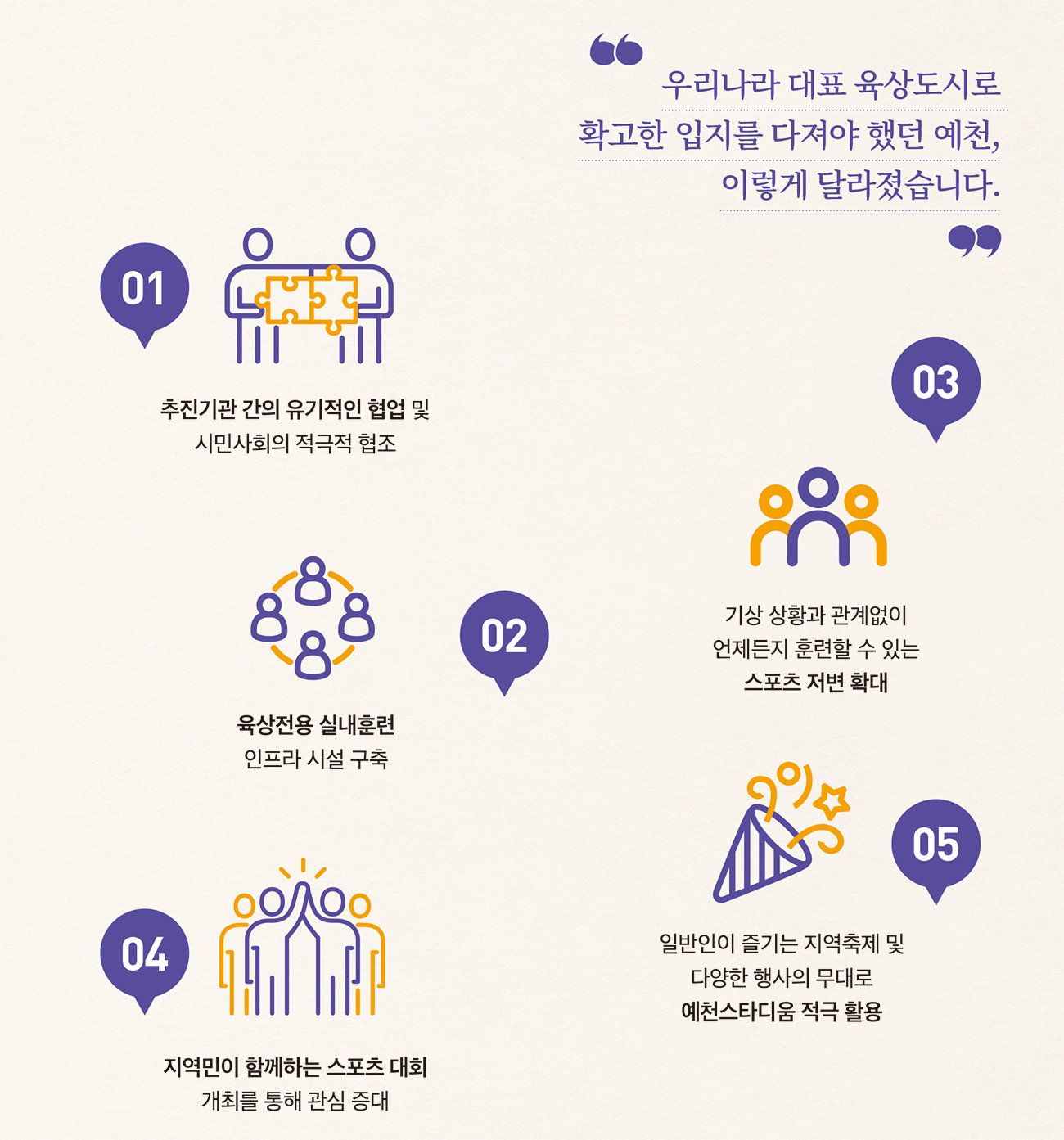 한 도시가 그 도시만의 독창적 정체성을 가지는 것은 도시의 발전이나 지역균형발전의 측면에서 매우 중요하다. 지역 정체성을 가지고 이로 인해 경제적 효과까지 얻을 수 있다면 주민이 지역에 대해 느끼는 자긍심이나 애향심도 훨씬 커질 것이다. 예천은 지난 30여 년간 양궁의 도시, 곤충의 도시로 알려져 있었다. 그리고 이제는 육상의 메카로 거듭나고 있다. 예천의 육상 훈련장은 육상선수들의 기량 상승은 물론 육상 인구의 저변 확대에도 기여함으로써 우리나라 육상이 세계 수준에 도달하는 밑거름이 되고 있으며 미래 예천의 경제, 사회, 문화의 발전을 이끌어 가는 동력이 되고 있다.