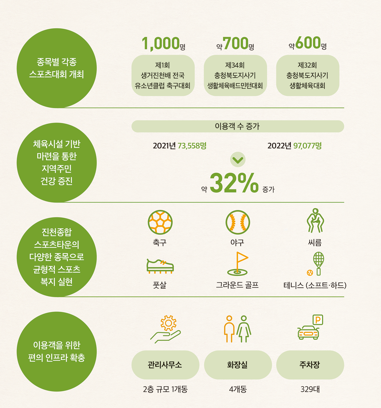 남녀노소 누구나 즐길 수 있는 종목별 종합생활체육시설 조성은 생거진천을 더욱 역동적인 도시로 만들었다. 종합스포츠타운의 건립은 기존의 학교 체육시설이나 단일 종목의 소규모 체육시설 위주로 이용하던 주민들에게 스포츠 도시의 자부심과 스포츠문화를 향유하는 즐거움까지 안겨주었다. 시설 활용도의 증가는 물론 그에 따른 만족도 역시 매우 높게 나타났다. 생활체육대회를 비롯하여 기업체, 각종 단체의 행사 등 시설 활용이 다층적으로 다양하게 이루어졌다. 이처럼 주민의 화합과 기업의 공동체 형성에 크게 기여하고 있는 곳이 바로 진천종합스포츠타운이다. 진천종합스포츠타운 건립의 장점은 다양한 종목의 시설물과 휴식공간을 제공한다는 점이다. 가족과 함께 힐링할 수 있는 주변의 자연과 스포츠타운이 조화를 이루고 있어 복합스포츠 문화공간으로 자리매김하고 있다. 또한 양질의 체육시설과 더불어 편리한 교통망은 스포츠마케팅으로 자연스럽게 연결되어 지역경제 활성화에도 기여하고 있다.