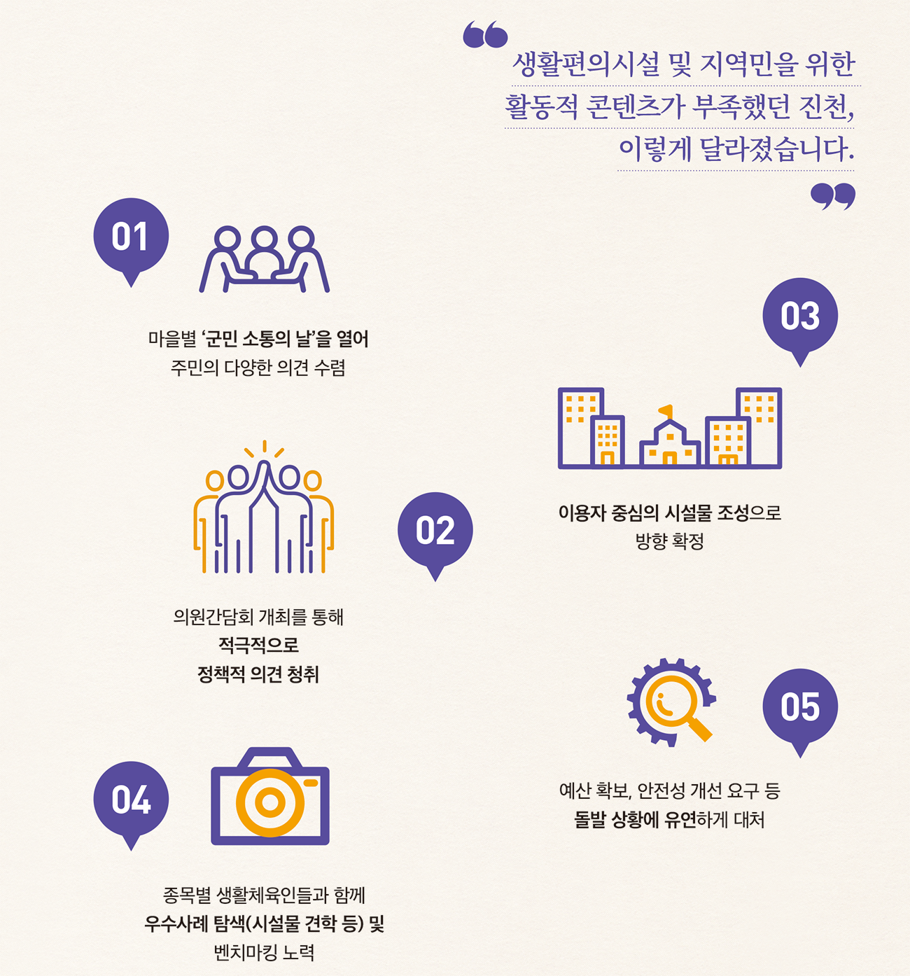 진천을 스포츠 중심 도시로 우뚝 세우기 위해 군은 심혈을 기울였고 적극적으로 나섰다. 군수 주재의 마을별 ‘군민 소통의 날’을 열어 주민의 다양한 의견을 수렴하였으며, 동시에 의원간담회를 개최하여 정책적 의견을 청취하였다. 더 나은, 더 편리한, 더 안전하고 쾌적한 시설을 구축하기 위해 종목별 생활체육인들과 함께 벤치마킹도 수차례 진행되었다. 무엇보다 시설을 직접 이용할 주민이 주도적으로 사업을 추진하고 사업에 참여하도록 힘썼다. 기본계획에서부터 사업 종료 시점까지 군민들과 함께 했다. 군민들의 의견을 반영하고자 종목별 동호회 회원들과 기 조성된 여러 시설물을 견학했다. 그 과정에서 시설물의 규격과 특성 등을 구체적으로 고민하였고, 이를 시설물 조성에 반영하기 위해 힘썼다.