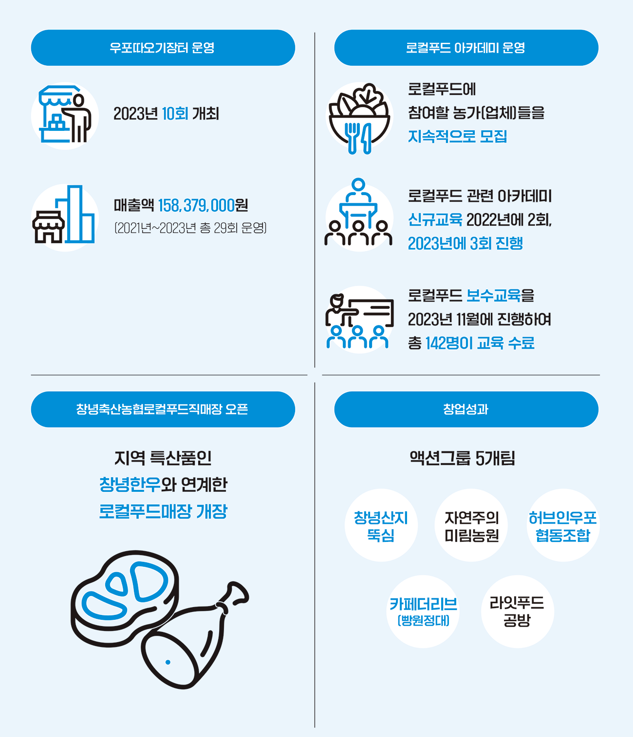 창녕군이 일군 성과는 일관성이 있다. 바로 ‘누군가’의 노력이 아닌 ‘모두’의 노력을 통한 살아있는 변화를 꿈꿨다는 점이다. 얼마 전. 창녕군과 창녕축산업협동조합의 협업으로 지역에서 생산되는 지역 농.축산물의 판로개척을 위한 창녕축협로컬푸드직매장을 조성하여 개장하였고, 로컬푸드 아카데미를 운영하여 2023년 142명의 교육 수료자를 배출하였다. 우리 지역민 스스로 생산한 농산물 및 가공품을 판매.홍보하는 시스템을 갖추어 경쟁력을 강화한 것이다.