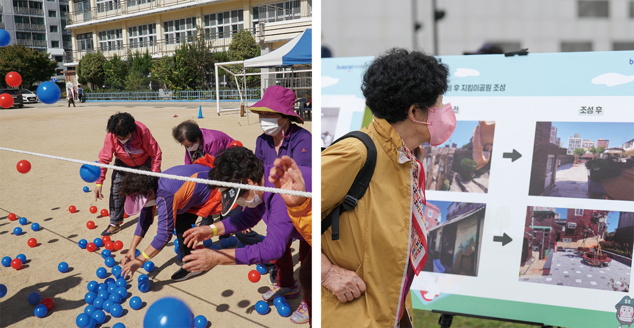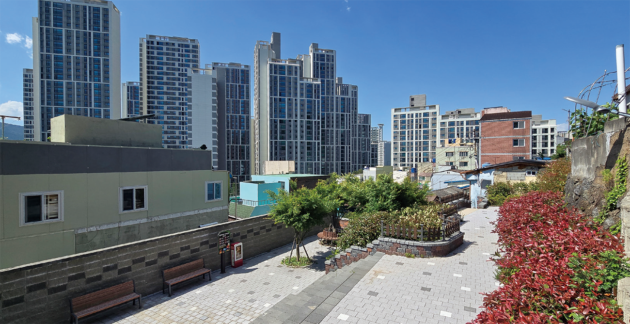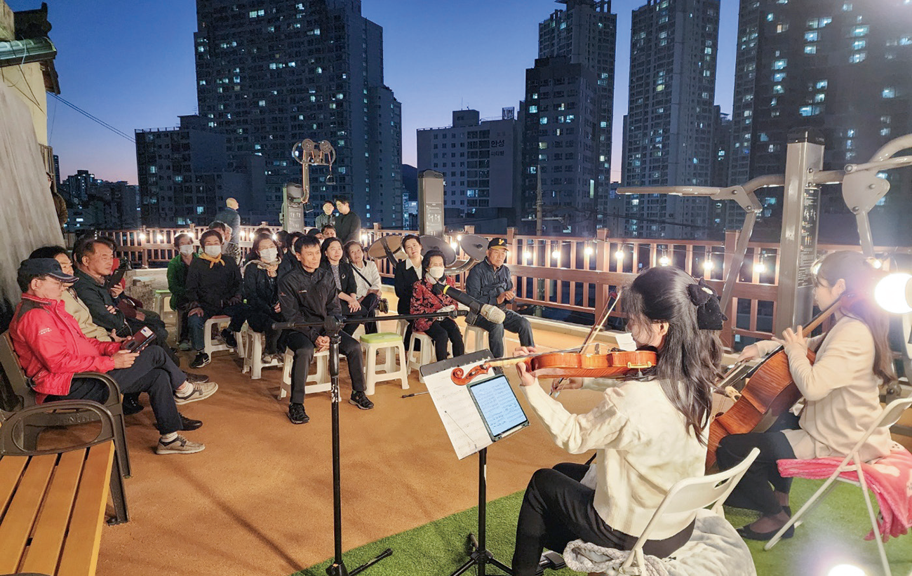 보행환경 개선을 위한 편안길 조성, 운동시설과 쉼터를 갖춘 단단이 모임터도 시공을 마치고 마을의 중요한 소통공간으로 자리잡았다. 특히 집수리 지원과 빈집 정비에는 한국해비타트, 포스코건설 그리고 서울여자대학교까지 민·관·학이 함께하는 ‘2021 도시혁신스쿨 in 부산‘이 힘을 보태 성과를 더했다. 주민들은 사람들이 함께 모여 낡은 집을 고쳐주고, 사는 이야기를 나누는 경험만으로도 충분히 위로가 되는 시간이었다고 말했다. 어쩌면 재개발 없이도 밭개마을에 살아갈 이유가 있다는 희망이 조금씩 움트기 시작한 셈이다. 밭개마을 주변의 인식도 달라졌다. 지난해 10월, 단단이 모임터에서 열린 작은 음악회는 밭개마을 주민 외에도 인근 아파트 등 외부 주민이 관심을 보이며 지역간 소통의 물꼬를 트기도 했다.