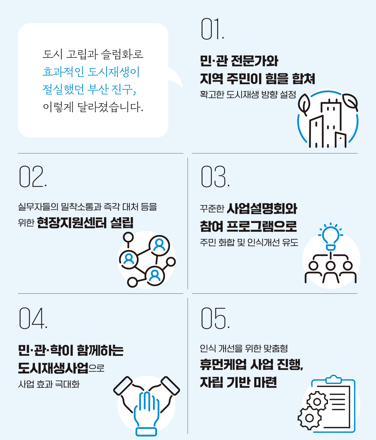 갈등의 실마리는 결국 끊임없는 소통과 이해로부터 나왔다. 무엇보다 불편에서 나아가 생존과 안전을 위협하는 주거 환경이 많았고, 단절감과 고립감도 시급히 해결해야 할 과제였다. 현장지원센터와 주민센터는 꾸준한 사업설명회와 주민을 위한 각종 소통 프로그램, 취미 활동을 지원하며 밀착 소통을 이어 나갔다.