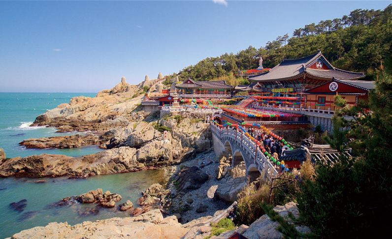부산 기장의 시랑리 해안에 위치한 해동용궁사는 정암화상(晸庵和尙)이 바닷가에서 용을 타고 승천하는 관세음보살을 꿈에 보았다는 이야기에서 이름이 유래되었다. 산과 바다가 맞닿은 육지의 끝자락에 해동용궁사가 한 폭의 그림처럼 걸려있다. 일주문을 지나 송림 사이로 이어진 108계단에 들어서면 푸른 바다를 품은 해동용궁사와 만나게 된다. 사찰과 연결된 용문교 위에서는 많은 방문자들이 동전을 던지며 소원을 비는 광경을 자주 목격하게 되는데 이는 간절히 빌면 한 가지 소원은 꼭 이뤄준다는 용궁사의 영험함에서 유래했다.