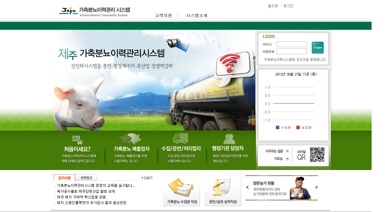 가축분뇨 전자관리시스템의 도입을 위해 제주도 축정과 공무원들은 도내 양돈농가에 대한 분뇨처리실태 일제조사부터 실시했다. 농가에서 발생되는 분뇨량을 정확히 파악하는 것이 관건이기 때문이다. 전체 양돈농가 312개소, 도내 분뇨 수거·운송차량 90대를 대상으로 양돈농가별 분뇨 발생 및 수거 D/B를 구축했다. 한편 홈페이지 관리매뉴얼 구성을 위해 환경부와 관련부서 자문 및 협의를 진행하고, 사업자 입찰 공고 및 선정 심의위원회를 개최하여 KT컨소시엄을 사업 대상자로 선정, 본격적으로 시스템 구축에 들어갔다. 사업비는 자체 지방비를 활용하였다. 가축분뇨 처리에 대한 도의 적극적인 지원의지를 확인할 수 있는 부분이다. 우근민 도지사가 “분뇨 수거·운송차량 운전자를 공무원으로 하는 것이 어떠냐”며 관리체계까지 확실하게 해 보자는 제안을 했을 정도다.