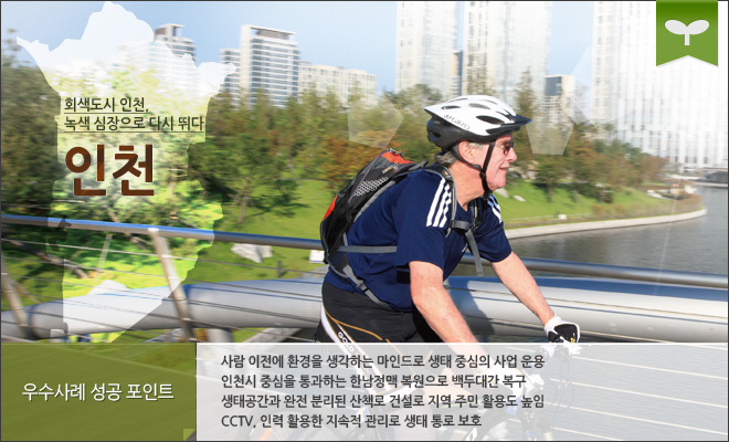 인천시는 오랫동안 수도권의 대표적 공업도시로 인식되어왔다. 인천하면 떠올랐던 것은 인천항의 흐린 회색하늘과 매연을 뿜어 올리는 공장굴뚝들, 그리고 계획 없이 들어선 주거지들이었다. 그러나 이러한 인천의 이미지들은 이제 과거의 것이 되어가고 있다. 인천시는 이제 어느 시군보다 다양한 생태계 개선 사업을 펼쳐나가며 녹색기후기금(GCF) 유치 도시로서의 면모를 갖추어 나가고 있기 때문이다.