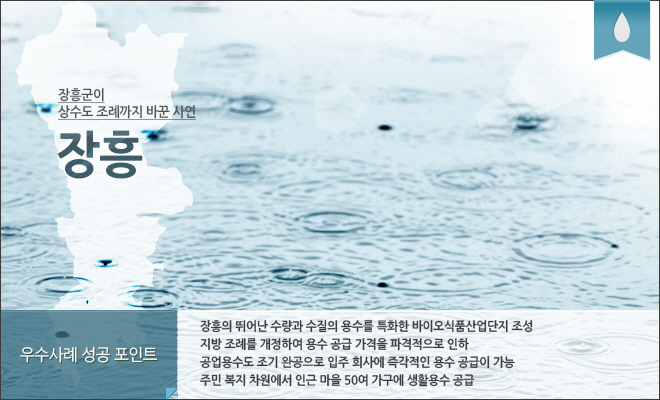 바이오식품산업단지가 조성된 주변 마을은 낙후된 지역이다 보니 상수도 시설이 제대로 되어 있지 않았다. 대부분 지하수를 쓰거나 인근 계곡물을 길러다 사용하기도 했다. 그런데 공사 중에 계곡이 일부 훼손되는 일이 발생했다. 주민들로부터 항의가 빗발쳤다. 장흥군 상하수도사업소 위장일 상수도담당관은 이에 대한 해결책으로 산업단지 내 정수를 주민들에게 공급하자는 아이디어를 냈다. 바이오식품산업단지에선 이미 정수를 사용하고 있었기 때문에 별도의 처리 없이 생활용수로 사용하는 데 아무런 문제가 없었다. 장흥군에서는 주민 물 복지 차원에서 이를 흔쾌히 받아들였고, 군비를 들여 인근 마을에 수도관을 새로 설치했다. 이로써 인근 세 개 마을 50여 가구에 생활용수가 공급될 수 있었다. 공사 중 발생한 민원을 원만히 해결함을 물론, 주민들의 삶의 질을 높이는 긍정적인 효과를 거두었다.