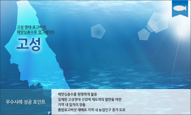 그러나 최근 몇 년 사이 고성은 침체의 늪에서 허덕이고 있다. 지구온난화와 무분별한 포획으로 인한 수산 자원의 고갈은 지역 경제를 송두리째 흔들어놓았다. 인구 노령화와 일자리 감소 등 우리나라 농어촌이 겪는 고질적인 문제까지 더해졌다. 더욱이 금강산 관광 중단으로 지역을 찾던 외지인의 발길까지 뚝 끊겼다. 지역 경제의 재도약을 위해서는 새로운 성장 동력이 절실한 상황. 고성군은 과거 고성명태의 명성을 되찾기 위한 노력에 돌입했다. 또한 신기술 고품질의 톱밥표고버섯으로 농가소득을 높이고 귀농 인구를 유입한다는 계획도 수립했다. 이러한 고성군의 경제 살리기 정책에 믿음직한 지원군이 있었으니, 바로 동해의 청정수역에서 뽑아 올린 해양심층수다.