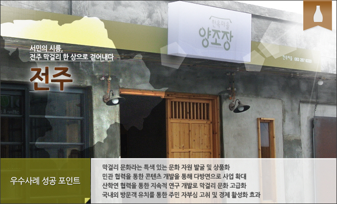 이제 사람들은 전주에 오면 한정식, 비빔밥, 콩나물 국밥 그리고 막걸리를 맛본다. 전주 막걸리 골목에서는 아직도 주전자 단위로 술을 판매한다. 한 주전자를 시키면 한 상 가득 전주의 손맛이 담긴 안주가 곁들여 나온다. IMF를 기점으로 부활한 전주시의 서민 문화 막걸리는 낙후되었던 막걸리 골목을 활성화시켰고 이는 어려웠던 시절 막걸리로 시름을 달래던 전주시 서민 상권을 부활시켰다. 우리 전통문화의 힘은 이처럼 무궁무진하다. 막걸리 프로젝트의 성공 역시, 이처럼 오랜 시간 우리 문화유산을 소중히 지켜온 전주시의 힘인 것이다.