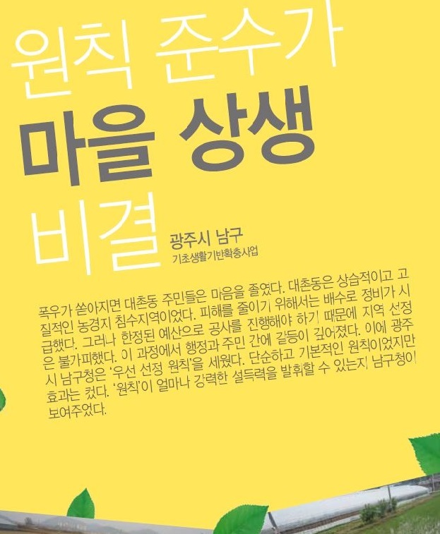 폭우가 쏟아지면 대촌동 주민들은 마음을 졸였다. 대촌동은 상습적이고 고질적인 농경지 침수지역이었다. 피해를 줄이기 위해서는 배수로 정비가 시급했다. 그러나 한정된 예산으로 공사를 진행해야 하기 때문에 지역 선정은 불가피했다. 이 과정에서 행정과 주민 간에 갈등이 깊어졌다. 이에 광주시 남구청은 ‘우선 선정 원칙’을 세웠다. 단순하고 기본적인 원칙이었지만 효과는 컸다. ‘원칙’이 얼마나 강력한 설득력을 발휘할 수 있는지 남구청이 보여준 예다.