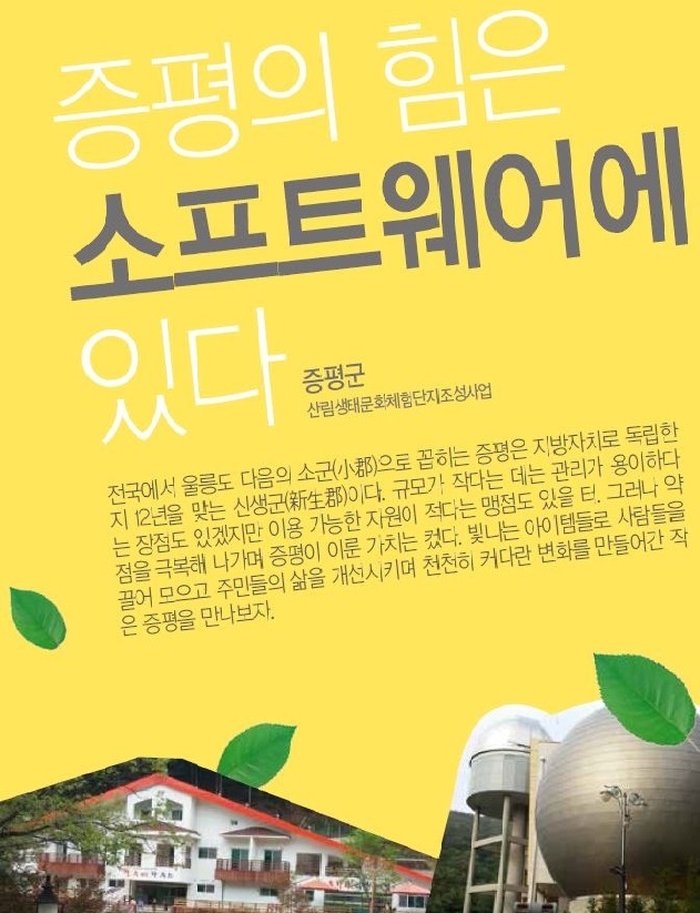 이렇게 다양한 노력으로 증평의 인구는 지난 6년간 14.06%나 증가했다. 작은 지방자치단체인 만큼 큰 수확이 아닐 수 없다. 면적이 작은 만큼 증평군은 끊임없이 다른 지자체와 함께 아이디어를 공유할 수 있는 방향을 연구해 나가고 있다. 경기도 차주 출판단지 내 샘터사 등 어린이 동화 출판관계자들의 숲속동화마을 조성에 대한 제안과, 증평과 가까운 남차리, 남하리 등에 조성된 전원마을인 행복마을과의 연계는 산림생태문화체험단지의 다양한 소프트웨어가 증평에만 머무르지 않고 다른 지역에서 활용될 수 있는 새로운 가능성을 제시해 주고 있다.