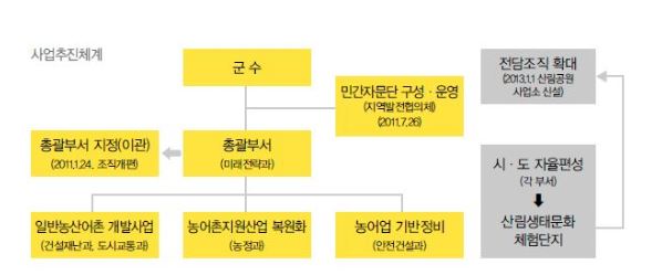 - 2008년 수립한 ‘율리 웰빙타운 조성기본계획’을 바탕으로 중앙정부 부처별로 공모하는 관련 사업을 발굴?기획하여 선정 추진