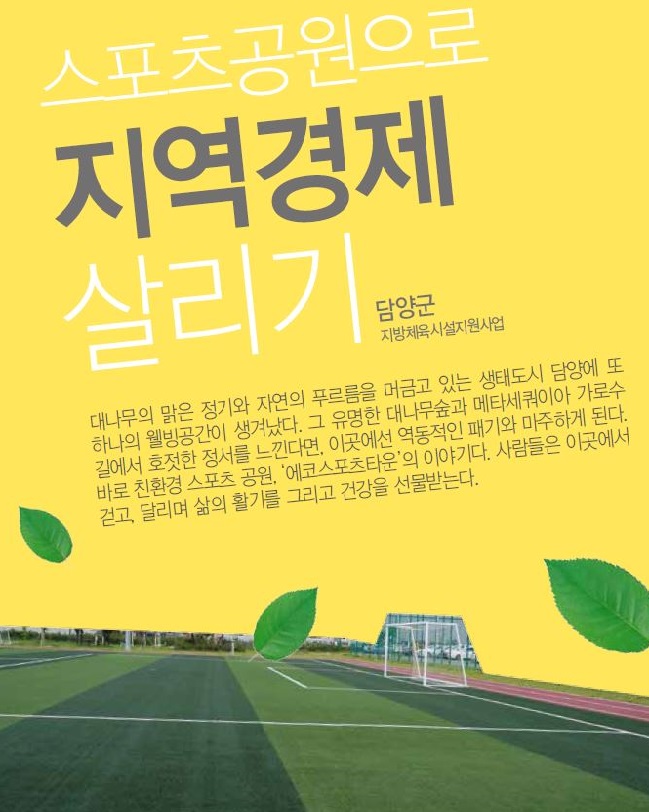 대나무의 맑은 정기와 자연의 푸르름을 머금고 있는 생태도시 담양에 또 하나의 웰빙공간이 생겨났다. 그 유명한 대나무숲과 메타세쿼이아 가로수길에서 호젓한 정서를 느낀다면, 이곳에선 역동적인 패기와 마주하게 된다. 바로 친환경 스포츠 공원, ‘에코스포츠타운’의 이야기다. 사람들은 이곳에서 걷고, 달리며 삶의 활기를 그리고 건강을 선물 받는다.