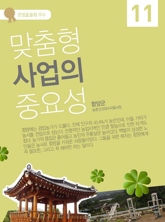 함양에는 겸업농가가 드물다. 전체 인구의 43.4%가 농민인데, 이들 거의가 농사를 전업으로 삼는다. 전형적인 농업지역인 만큼 탈농으로 인한 타격도 컸다. 농가의 몸집은 줄어들고 농민의 주름살은 늘어갔다. 백발이 성성한 노인들은 농사로 함양을 키워온 사람들이었다. 그들을 위한 복지는 함양에게 꼭 필요한, 그리고 꼭 해야만 하는 일이다.