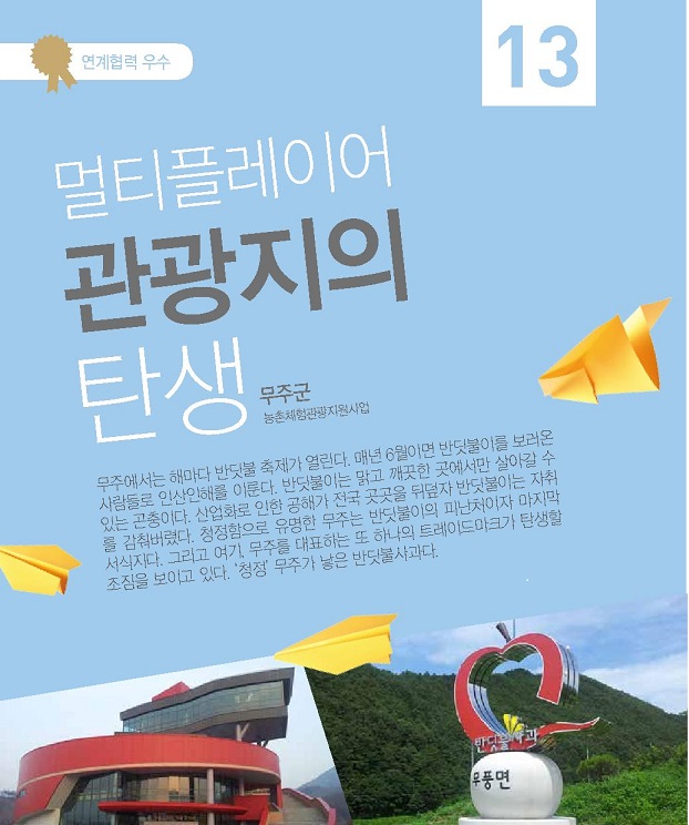 무주가 꿈꾸는 농촌의 모습이 있다. 바로 ‘농민도 부자 되는 고장’이다. 농사만으로 고소득을 올리는 것이 힘겨운 세상임을 알기에 무주는 더욱 열심이다. 그리고 반딧불사과는 이러한 무주의 꿈이 실현될 가능성을 제시해주었다. 산더미 같은 과제 속에도 무주가 활기찬 이유다. 무주의 도약은 이제 막 시작됐다. 부자 고장으로 거듭날 무주의 내일을 주목해보자.
