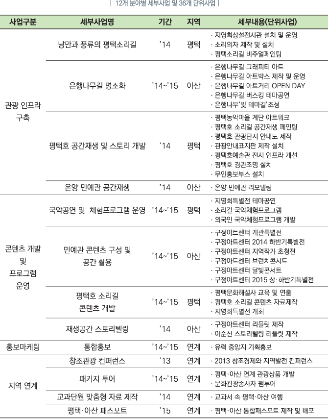 그러나 평택과 아산시가 서로 윈-윈할 수 있는 효율적인 연계 방안을 찾는 것이 처음부터 순탄치는 않았다. 양 시 모두 지역 여론을 수렴하고 통합적인 시각에서 지역 여건을 종합적으로 분석한 후 장기적으로 안정적인 시너지 효과를 거둘 수 있는 전략적 방향을 설정해야 했기 때문이다. 이를 해결하기 위해 양 시는 먼저 창조관광 기반조사 및 활성화 방안 연구라는 전문가 사전 컨설팅 연구를 공동 추진하였다. 이러한 과정을 거쳐 평택과 아산에게 꼭 필요한 관광거점과 인프라 정비 사업이 정해졌으며, 이를 토대로 관광 콘텐츠 및 프로그램 개발, 나아가 체계적으로 연계하는 12개의 분야별 세부사업과 36개 단위사업을 도출할 수 있었다.