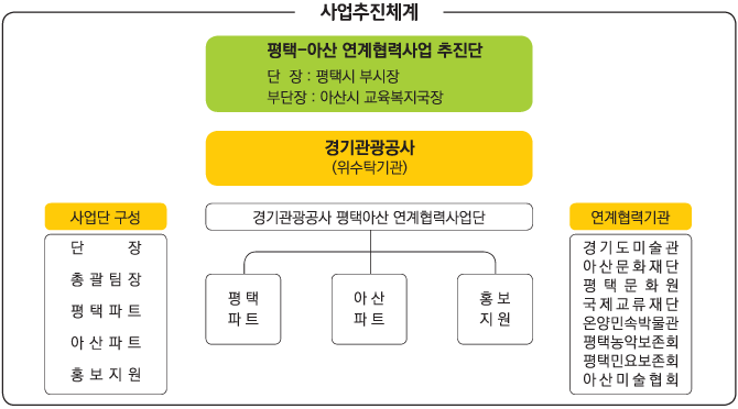 평택·아산 연계협력사업은 평택·아산연계협력사업추진단이라는 공동 추진체계를 구성하면서 본격적으로 시작되었다. 추진단은 평택시와 아산시 공무원의 당연직 4명, 각 지역이 추천한 지역전문가 4명, 그리고 외부전문가 4명 등 총 12명으로 구성되어 사업 추진방법, 중요사안에 대한 기본적 결정 등의 역할을 담당하였다. 추진단 회의를 통해 공기관 위탁과 입찰공고를 통한 다양한 위탁업체 참여를 검토한 결과, 관광 전문기관에 사업위탁을 결정하고 평택시·아산시·경기관광공사 3자간 업무협약을 체결함으로써 구체적인 사업들이 진행되었다.
