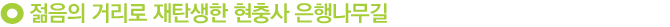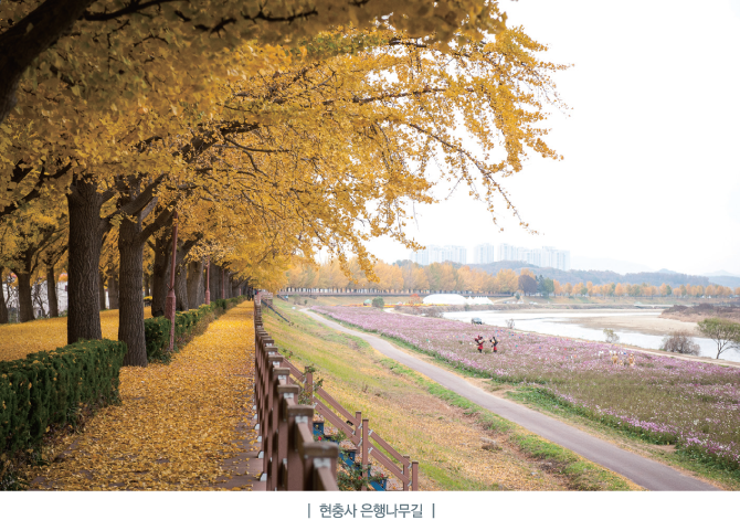 현충사 은행나무길은 한국의 아름다운 길을 대표하는 명소 중의 하나다. 은행나무길 명소화 사업을 통해 가을 단풍 시즌에 한정된 자연적 여건을 극복하고 야간은 물론, 연중 젊은이들이 즐겨 찾는 젊음의 거리로 조성되고 있다.