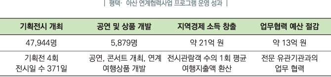 평택·아산 연계협력 사업을 성공적으로 이뤄낼 수 있었던 것은 우선 지역에 고유한 관광자원을 최대한 활용해 타 지역과의 차별성을 확보한 것에 있다. 또한, 경기도미술관을 비롯해 국악음반박물관, 온양민속박물관, 평택문화원, 평택시 국제교류재단, 아산문화재단 같은 전문기관 및 민간 전문가와 적극적 업무협력을 통해 개방적으로 사업을 추진함으로써 개별사업의 실패 가능성을 최소화한 것도 큰 몫을 하였다.