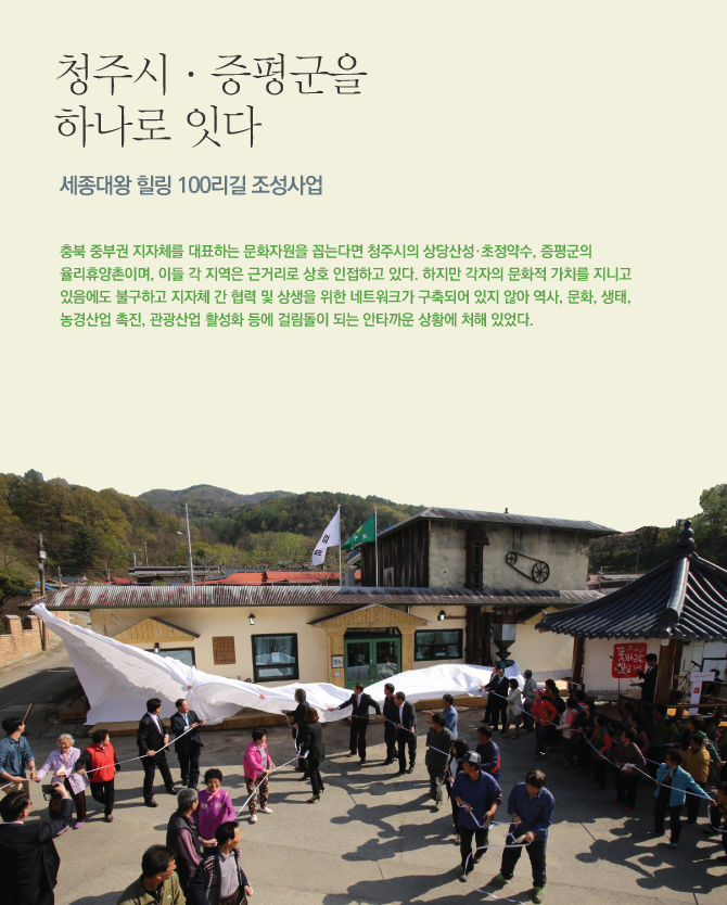 청주시, 증평군의 역사, 문화, 생태적 자원을 활용한 세종대왕 힐링 100리길 조성사업은 어느 한 시군에 치우치지 않고 3개 시군이 다 함께 협력해 추진함으로써 주민들이 실생활에서 체감할 수 있는 성과물로 탄생시켜 주민 소득 증대 사업과의 연계가 가능해졌다. 이뿐만 아니라 세종대왕이 117일간 요양하며 펼쳤던 다양한 문화정책을 스토리텔링화 한 세종대왕르네상스 사업과 연계해 사업의 효과를 극대화할 수 있도록 치밀한 계획 중에 있다.