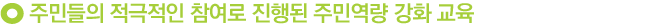 먼저 마을 주민과 사업 내용을 공유하고 각 마을별로 바람직한 마을의 미래상을 모색하며, 주민 참여를 통해 지역주민의 단합 및 화합을 유도, 해당 마을의 자생적 발전을 위한 토대를 마련하는 등 주민역량 강화를 진행하였다. 이어 마을 만들기 대학 프로그램(마을 만들기 워크숍, 전문가 특강, 선진지역 답사 등)을 진행해 주민참여와 마을 만들기에 대한 이해와 공감대를 형성하였다. 마을 만들기 주민참여 프로그램은 마을 주민 40여 명을 대상으로 매주 수요일 마다 12주에 걸쳐 실행했으며, 우수팀은 해외 선진지역 벤치마킹을 다녀오는 등 주민역량 강화 교육을 100% 주민 참여의 형태로 진행한 것이 가장 돋보이는 점이라 하겠다.
