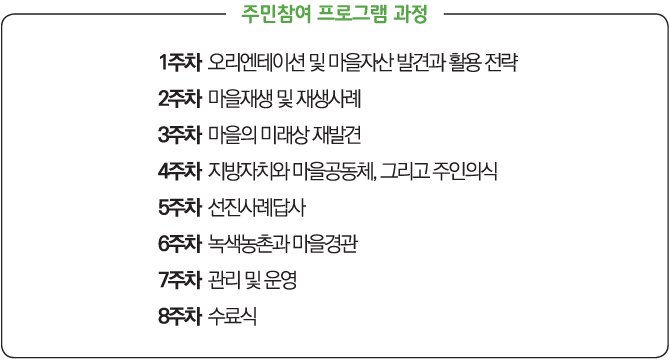 마을주민들의 마을 발전과 그에 따른 기대효과를 바라는 마음은 너무 간절했으며, 이를 실현시켜줄 지도교사를 각 마을에 1명씩, 총 8명을 선정해 1주차는 입학식 및 오리엔테이션과 마을자산의 발견과 활용전략이라는 특강으로 준비하였다. 2주차는 마을재생 및 재생사례 특강으로 이루어졌으며, 3주차는 마을의 미래상(역사, 문화, 예술, 특산품 등) 재발견으로 진행하였다. 4주차는 로컬 거버넌스인 지방자치와 마을공동체, 그리고 주인의식이라는 주제로 특강을 실시했으며, 5주차 선진사례답사에 이어 6주차는 녹색농촌(생태, 환경, 기후)과 마을경관을 주제로 강의를 진행하였다. 7주차는 유지, 관리, 운영의 중요성을 강조한 관리운영부분을 강의했고, 8주차에는 수료식으로 이뤄져 지역역량강화사업에 만전을 기했다.