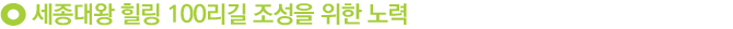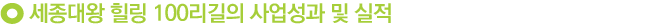 이밖에 마을분석 및 콘텐츠 개발 조사연구 마스터플랜을 마무리했으며, 세종대왕 힐링 100리길을 상징화 할 수 있는 BI 개발과 함께 10개 종류의 특허청 상표권 등록도 진행한 상태다. 여기에 권역별 마을 이야기, 풍경 등을 영상 다큐멘터리로 제작(내셔널지오그래픽, MBC, KBS 등)해 전국적으로 홍보할 수 있도록 크게 성장하였다. 한편, 구간별 주요 내용 100가지를 스토리텔링 형식으로 구성해 출간한 여행안내서는 방문객들에게 독특하고 감성적인 안내서로 각광받고 있다.
