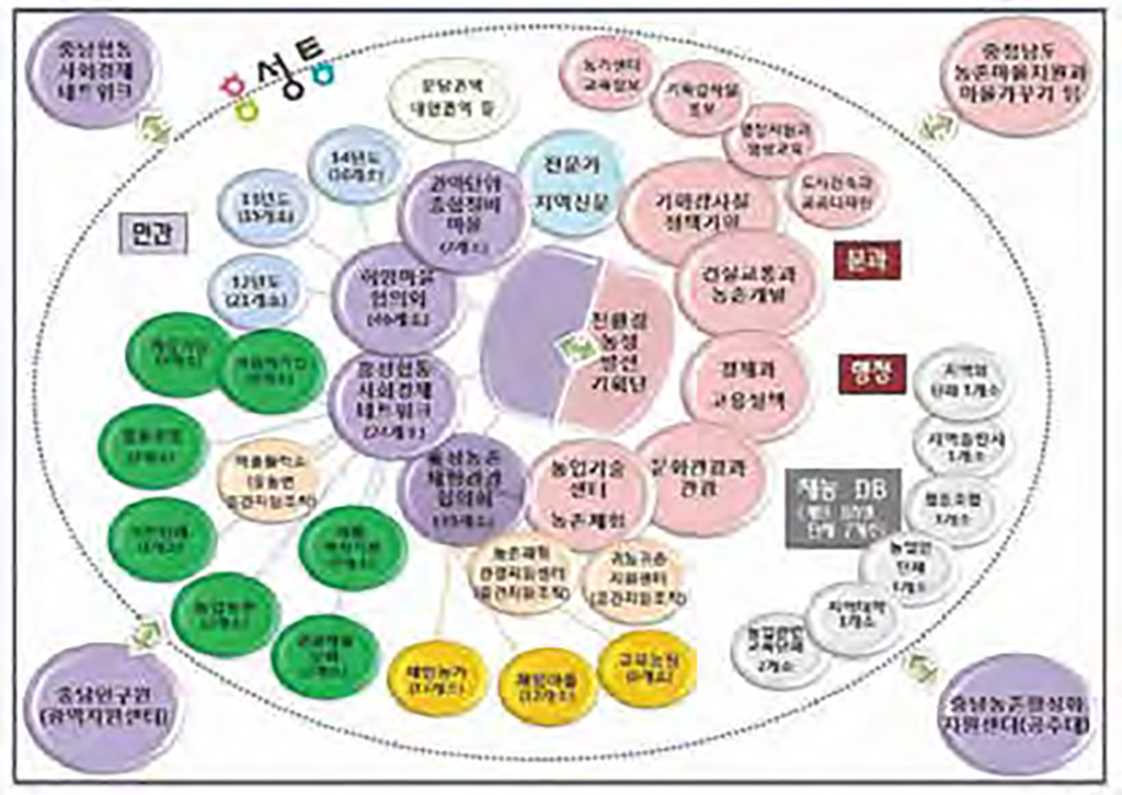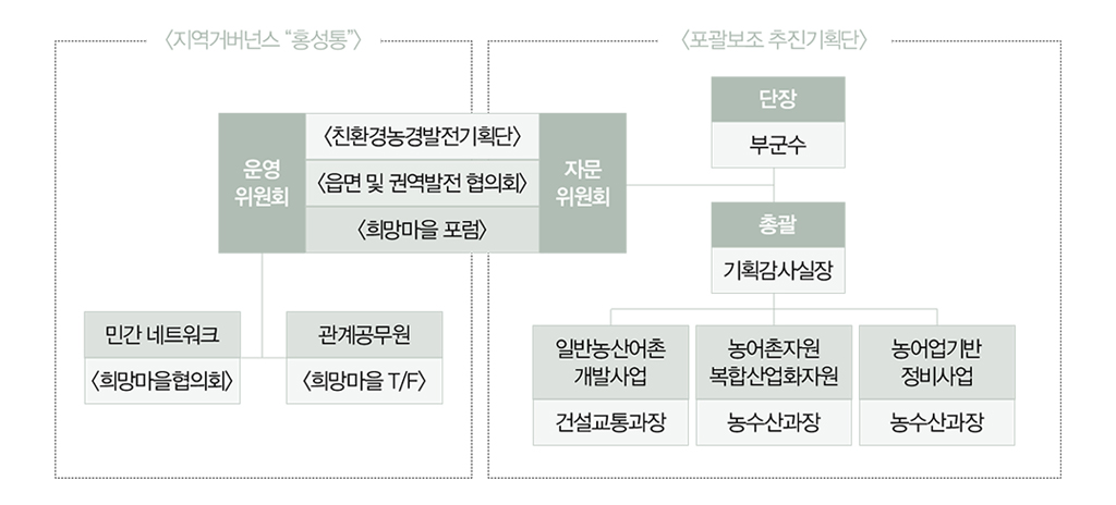 홍성은 사회적 기업, 협동조합, 사회적 단체 등이 활발하게 활동하고 있는 곳이기도 하다. 친환경 오리 농법을 최초로 도입하고, 농촌마을종합개발사업의 모델을 제시하 는 등 ‘원조’가 많았기 때문일까. 이미 수많은 민간단체가 자생하고 있었다. 그리고 그 민간단체들은 일반농산어촌이란 포괄보조 사업 안에 크고 작은 형태로 관여하고 있 었다. 권역과 사회적 기업이 함께 권역 사업을 추진하기도 하고, 마을만들기사업을 효율적으로 진행하기 위해 군이 민간단체에 자문을 구하기도 했다. 홍성군은 이 점에 주목했다. 이미 자생되어 있는 부분을 포괄보조 사업에 본격적으로 끌어들여, 지역 내 단체들이 자연스럽게 소통할 수 있는 구조를 만들고자 했다. 각종 사업으로 형성 된 조직들, 여러 경험과 시행착오를 겪은 사람들, 문당·내현권역과 같은 선도적인 권 역, 농촌체험관광협의회, 협동사회경제네트워크, 희망마을협의회, 권역사무장 모임 등 다양한 단체가 소통하고 함께 문제에 대응하는 민관시스템인 ‘홍성통’을 만들어낸 것이다. 그리고 친환경농정발전기획단은 홍성통 내부를 조정하는 코디네이터 역할 을 맡았다. 홍성군은 홍성통을 통해 이미 조직된 주체가 사업의 내·외부 발전 과정에 적극적으로 개입하도록 함으로써, 그 과정 속에서 자연스럽게 역량이 강화되는 것을 목적으로 삼았다. 각 분야의 전문가들을 홍성통이란 거버넌스 체계로 모이게 하여, 서로 시너지 효과가 나도록 유도한 것이다.