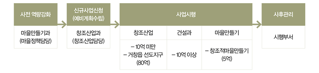 그동안 사업 총괄을 담당하던 ‘창조정책과’는 사업진행과정 중 ‘창조산업과’로 이름 을 바꾸었다. 사업 프로세스가 제대로 갖춰진 상황에서 이제는 전체적인 비전에 맞는 적절한 신규 사업을 발굴하는 것이 중요해진 까닭에서였다. 때문에 ‘창조산업과’는 사업총괄과 동시에 신규 사업 및 예비계획 수립을 담당했다. 신규 사업을 선정하는데 있어 ‘창조산업과’가 가장 중요하게 생각한 가치는 지역 내 사업들 간의 연계가능성이 었다. 이러한 연계는 도시개발사업, 지역개발사업 등의 개발 사업뿐만 아니라 지역 내산업자원과 문화자원을 활용하는 것으로도 확장되었다. 특히 최근에는 스토리텔링 방식으로 지역문화자원을 다양하게 발굴하여 주민들의 지역의식을 함양하고 문화 및 복지 기능을 확충해 나가고 있다.