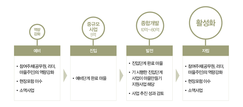 전체적인 거창 비전의 디테일을 채워나갈 예비 마을을 설계하는 곳은 ‘마을만들기과’ 이다. 과거에는 주민의 역량강화가 부족한 상태에서 사업을 진행하다보니 지역주민 의 갈등이나 인프라 구축, 사후 관리 등의 문제가 많았지만 ‘마을만들기과’가 신설되고 난 뒤 이러한 문제점들은 과거의 시행착오가 되었다. 사업을 진행하기 전부터 충 분한 준비단계를 거칠 수 있게 됐고 주민들의 역량과 의식수준도 높아졌기 때문이 업 무는 계속해서 업그레이드 됐다.