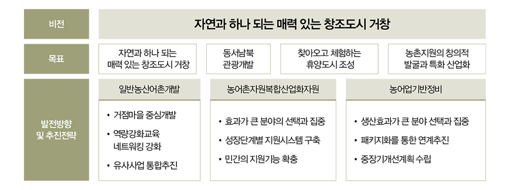 ‘일반농산어촌개발’이 처음 닻을 내린 것은 거창에 귀농열풍이 한창이던 2011년도의 일이다. 그리고 이때 사업의 원활한 진행을 위해 ‘총괄계획가’를 임명하고 창조정책과를 신설하였다. 거창군의 ‘총괄계획가’는 시행기간이 끝난 오늘날까지도 군내 곳곳에 서 이루어지는 내역사업의 컨트롤타워로서의 역할을 수행하고 있다. 이는 지난 4년 간의 진행과정에서 ‘총괄계획가와 창조산업가’가 거창군의 전체 사업에 얼마나 긴밀 하게 활용되어 왔는지를 말해준다.