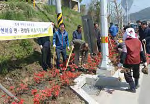 건설과 장시방 과장, 창조산업과 유태정 계장 가조면거점사업에서 보여준 주민 상향식(Bottom-up) 추진체계는 이제 거창군의 개 별 사업을 이끌어가는 동력이 되고 있다. 사업 초기 진행과정에서 공무원들이 보여준 노력이 주민들의 믿음을 샀고, 이렇게 형성된 신뢰관계가 또다시 주민 스스로를 움 직이게 한 것이다. 거창군은 지역 주민들의 자립적인 사업능력을 만들어갈 수 있도록 다양한 프로그램을 운영하고 있다. 마을의 문제를 해결할 수 있는 것은 결국 사람이 라는 단순명료한 사실을 깨달았기 때문이다.
