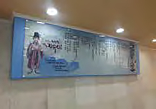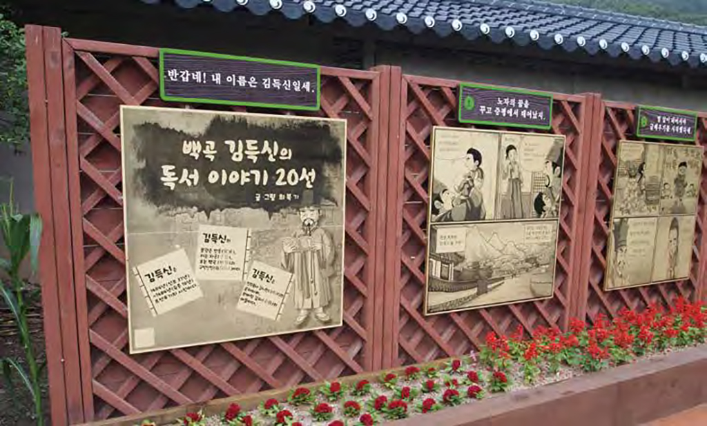 먼저 하드웨어사업을 살펴보자. 1차년도에는 김득신 상징조형물을 설치했고, 2차 년도에는 별무리 하우스 앞 벽면을 활용한 이야기 벽화를 조성했으며, 3차년도에는 율리 마을 내 담장을 활용한 이야기 동판 조성 및 포토존을 설치했다. 하드웨어사업 의 목적은 사업대상지인 율리 마을에 ‘이야기를 덧씌우는’ 것이었다. 김득신의 묘가 있는 율리마을 및 좌구산 일대에는 좌구산자연휴양림, 좌구산 천문대 등이 조성되 어 있어 기존에도 많은 사람들이 찾는 곳이었다. 증평군은 이러한 이점을 활용, 하 드웨어 사업을 추진하여 율리를 찾는 방문객들이 자연스레 김득신에 대해 알아갈 수 있도록 했다.