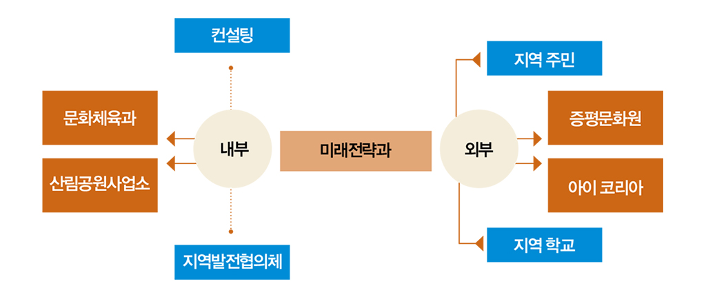 미래전략과에서 기획된 지역발전사업들은 단위 사업별로 각 부서에서 추진하고 있다. 미래전략과가 증평군의 지역발전사업을 조정하고 총괄하는 컨트롤타워 역할을 맡고 있는 것이다.