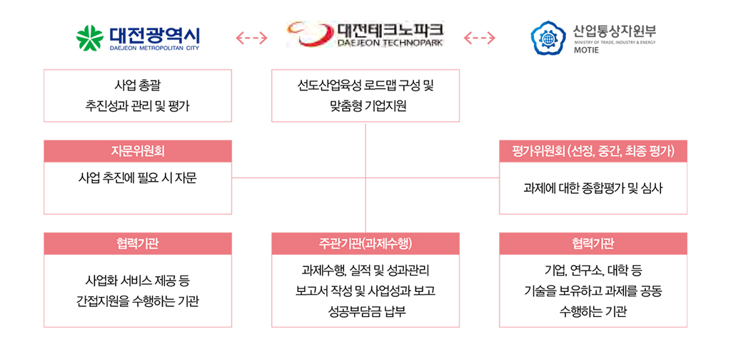 ‘첨단기술상용화지원사업’의 가장 큰 특징은 기업에 현실적으로 도움이 되는 지원을 추구한다는 것이다. 그러나 기업에 ‘현실적인’ 도움을 주기 위해서는 먼저 대상기업 과 산업 환경에 대한 ‘객관적인’ 파악이 우선되어야했다. 대전시는 지역의 이점인 산 학연 자원을 최대한 활용할 수 있는 시스템을 구축하기로 했다. 인력 Pool을 구성하 여 전문적인 서비스를 적시적소에 활용할 수 있는 방안을 마련한 것이다. 사업을 총 괄하는 대전시와, 시의 오른팔로 실질적인 업무를 수행하는 테크노파크 그리고 사 업의 전문성과 객관성을 보장하는 자문위원회와 평가위원회가 참여하여 내실 있는 추진체계가 완성되었다.