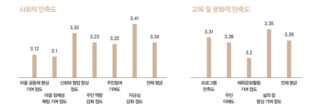 마을 공동체 형성 기여 정도 3.12 ,마을 정체성 확립 기여 정도 3.1 ,신뢰와 협업 향상 정도 3.32,주민 역량 강화 정도 3.23,주민참여 기여도 3.2,자긍심 강화 정도 3.41,전체 평균 3.24