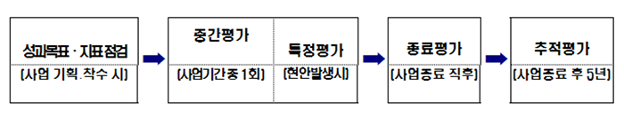 정부3)는 R&D투자 확대에 따른 투자효율성 제고를 위해 1999년부터 국가연구개발사업 성과평가제도를 도입·운영하고 있다. 국가연구개발사업 조사·분석·평가는 「과학기술기본법」 제12조, 동법 시행령 제20조에 근거하여 수행하고 있고, 이 중에서 평가는 「국가연구개발사업 등의 성과평가 및 성과관리에 관한 법률(이하 성과평가법)」4)에 근거하여 ①R&D사업 평가(중간평가-자체·메타5)), ②출연기관 및 연구기관 평가 등 2개 분야의 평가체계로 구성·운영되고 있다.